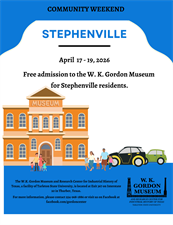 Event Description:Stephenville residents receive free admission to the W. K. Gordon Museum during the Stephenville Community Weekend.Location:65258 IH 20